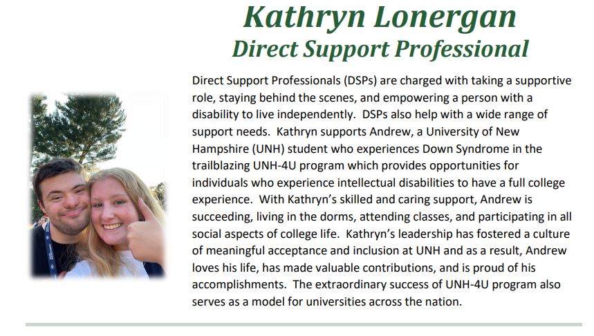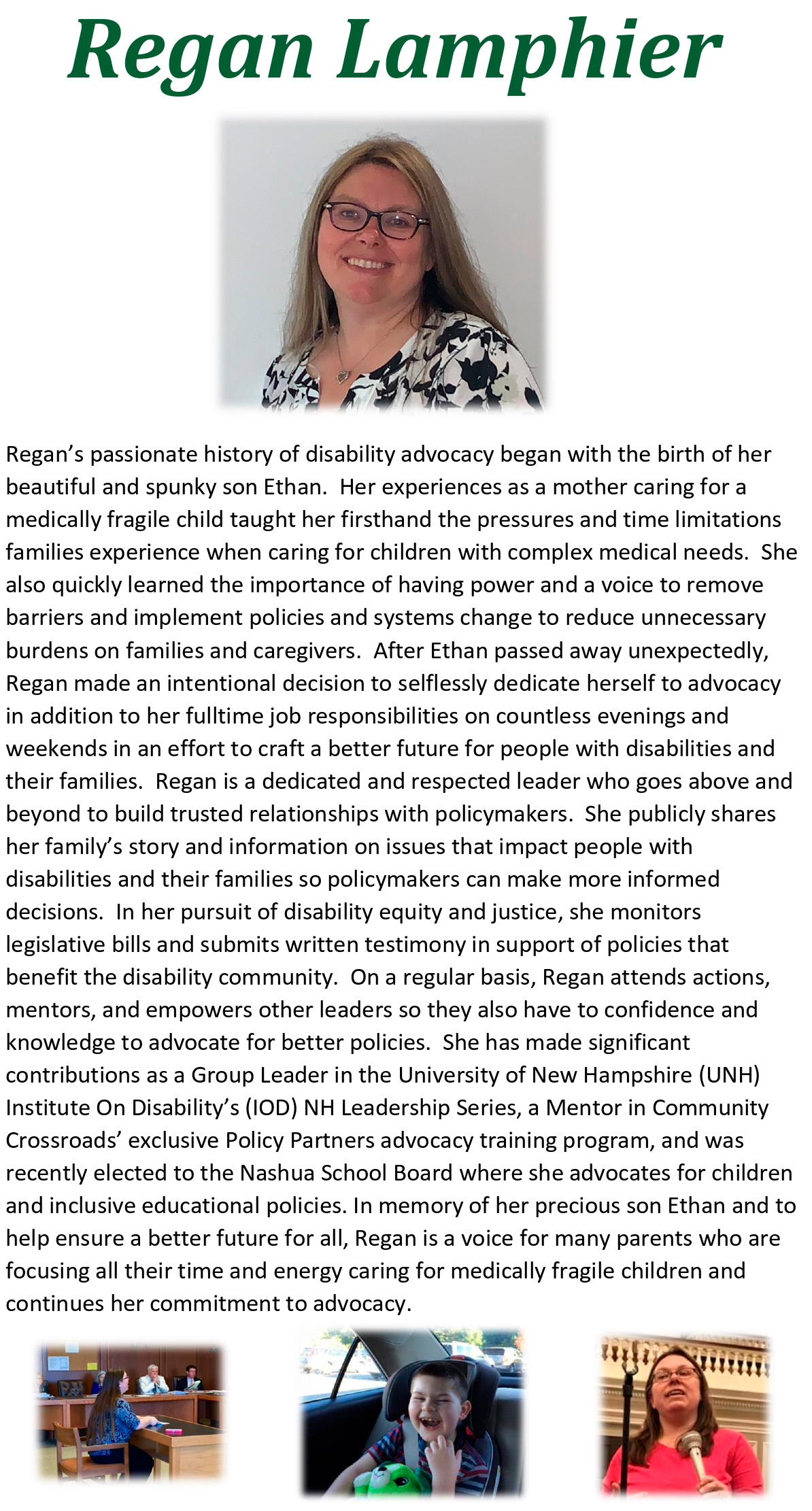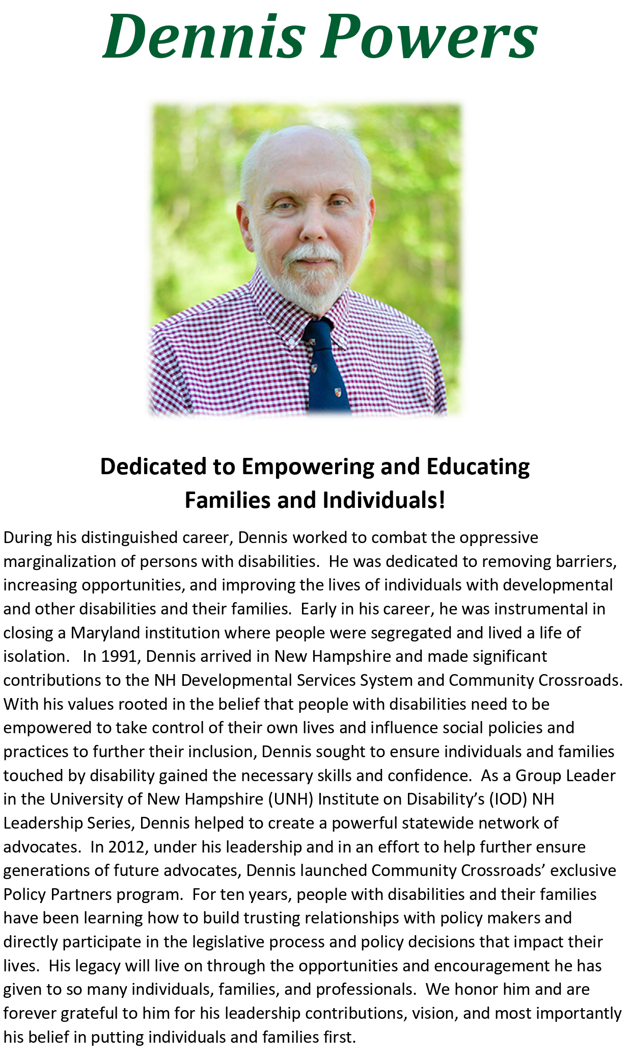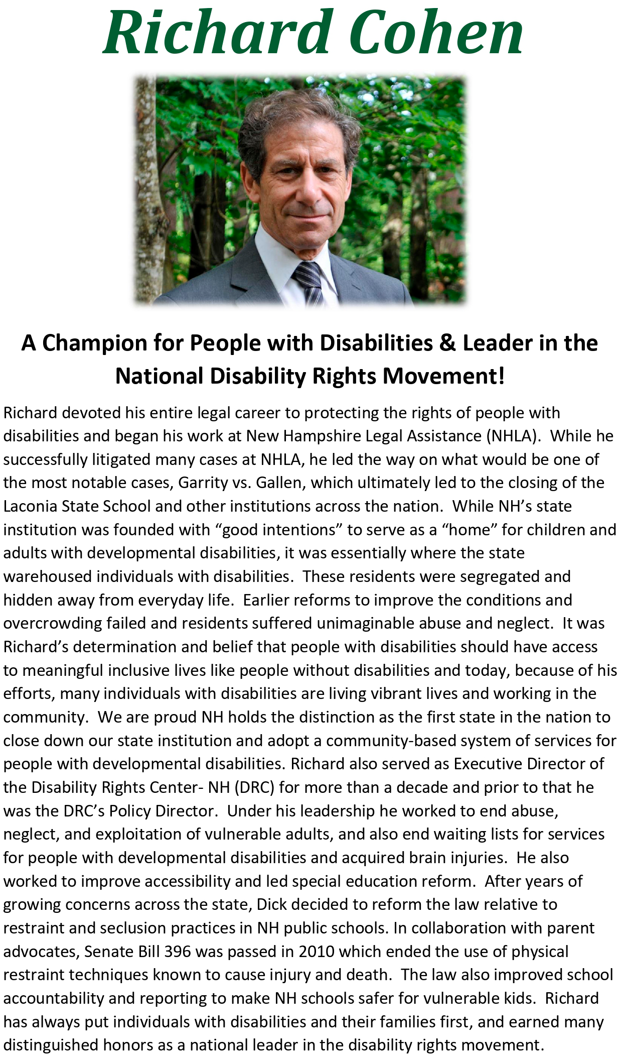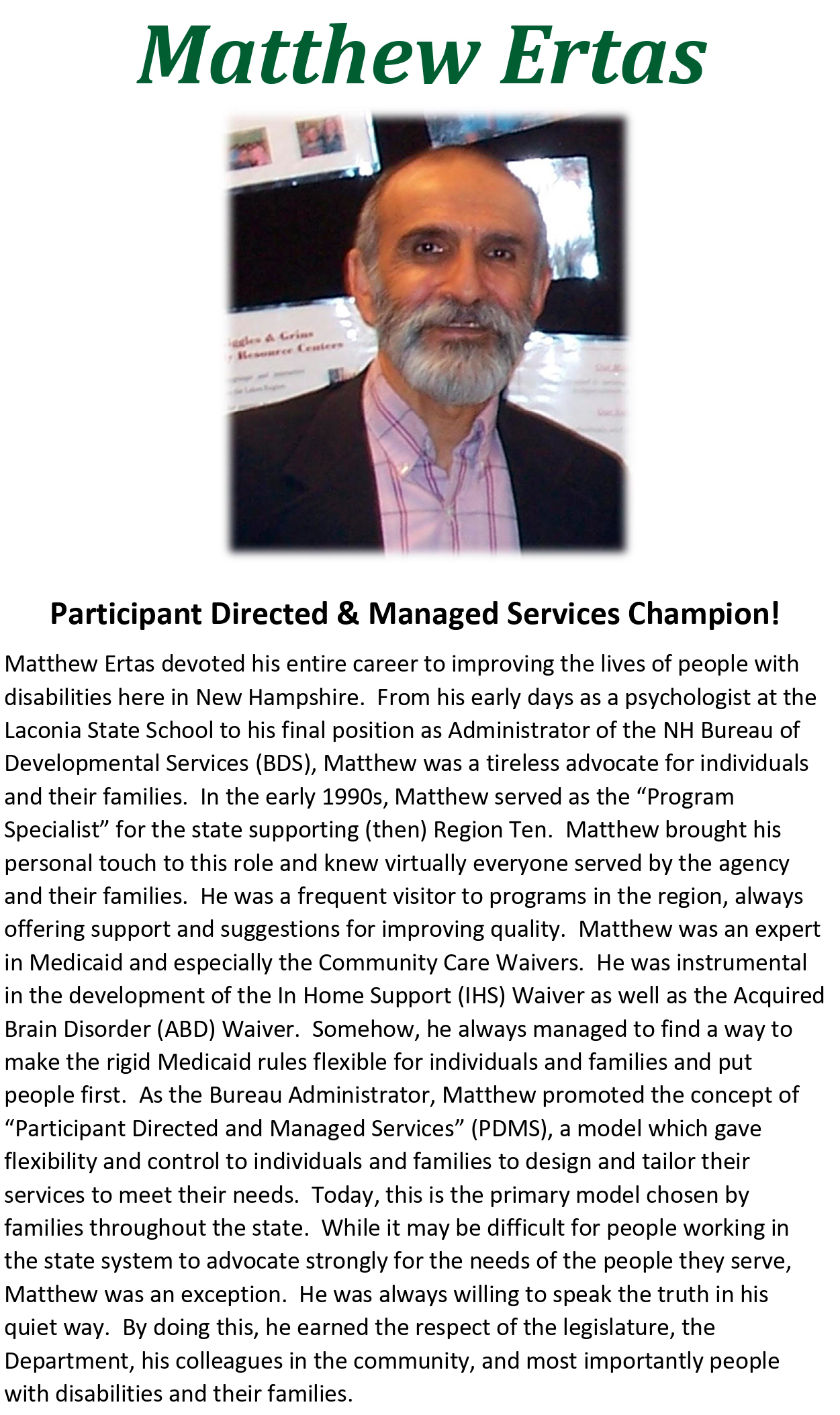 The Legacy Society Award is presented biennially to a New Hampshire citizen who has made a significant impact on public policy or public acceptance of individuals with disabilities. The recipient of this award has demonstrated the highest level of advocacy, over a prolonged period of time, resulting in stronger
