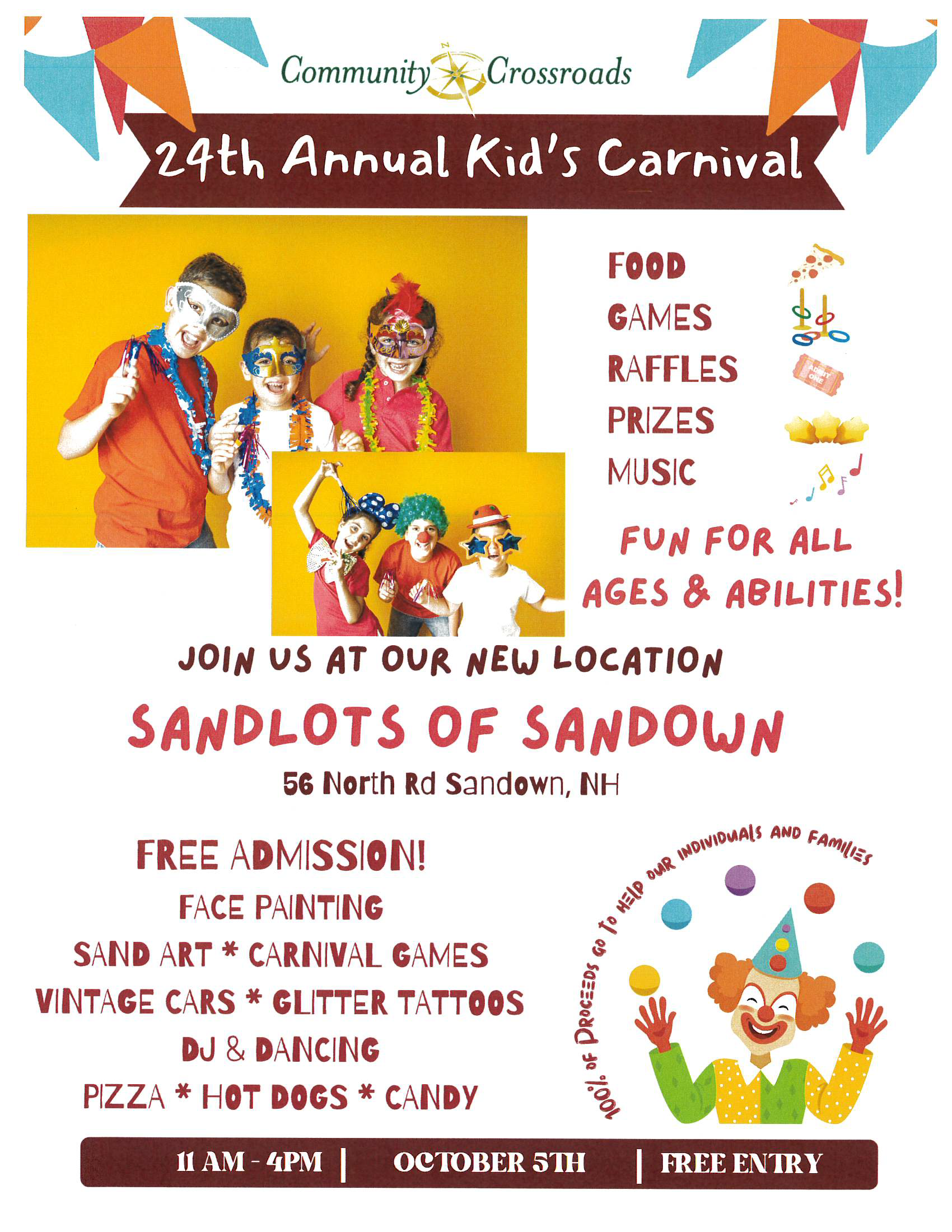This year our Kid’s Carnival will be held on Saturday, October 5th from 11 am to 4 pm. Our new location is Sandlots of Sandown: 56 North Road Sandown, NH.